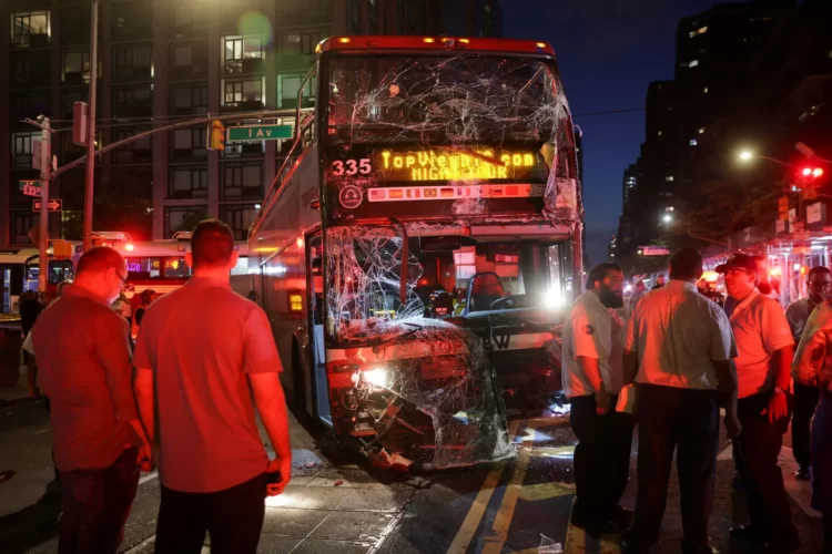 در تصویر زیر کارگران امداد و نجات در منهتن نیویورک در حال بررسی محل تصادف یک اتوبوس دو طبقه گردشگری با یک اتوبوس شهری هستند. شنبه ۱۷ تیر